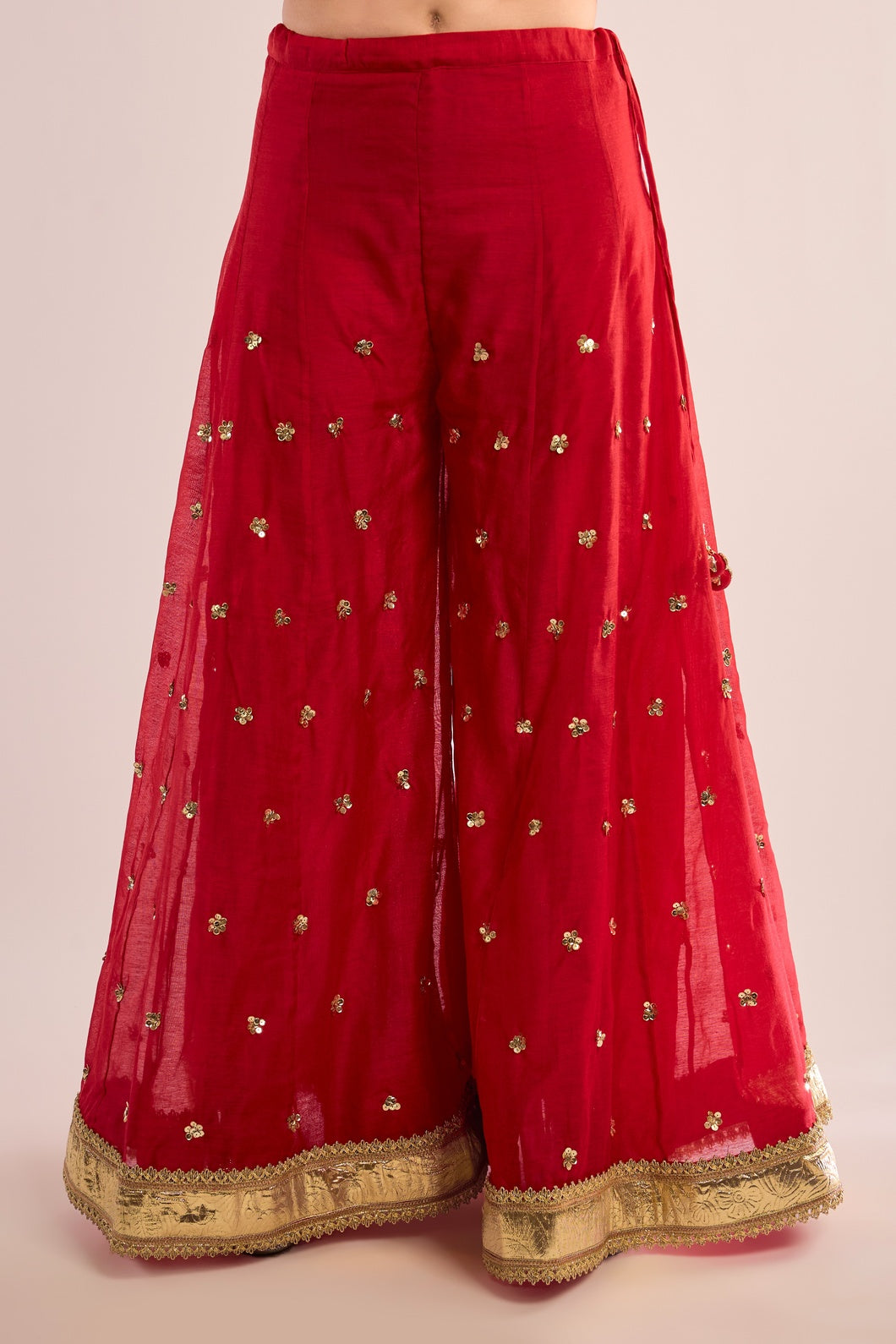 This exquisite A-Line kurta AFIFA is crafted from luxurious Chanderi fabric, paired seamlessly with a matching Sharara. It is elevated by a delicate organza dupatta, beautifully embellished with traditional Gota Patti embroidery. Featuring a classic neckline and three-quarter sleeves, this ensemble exudes timeless elegance and refined charm