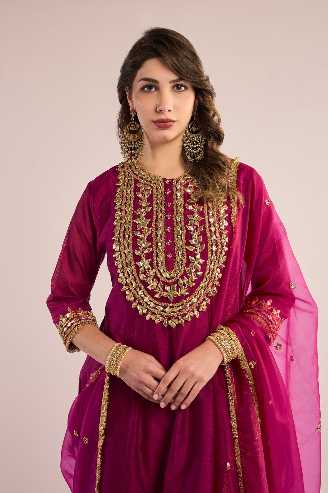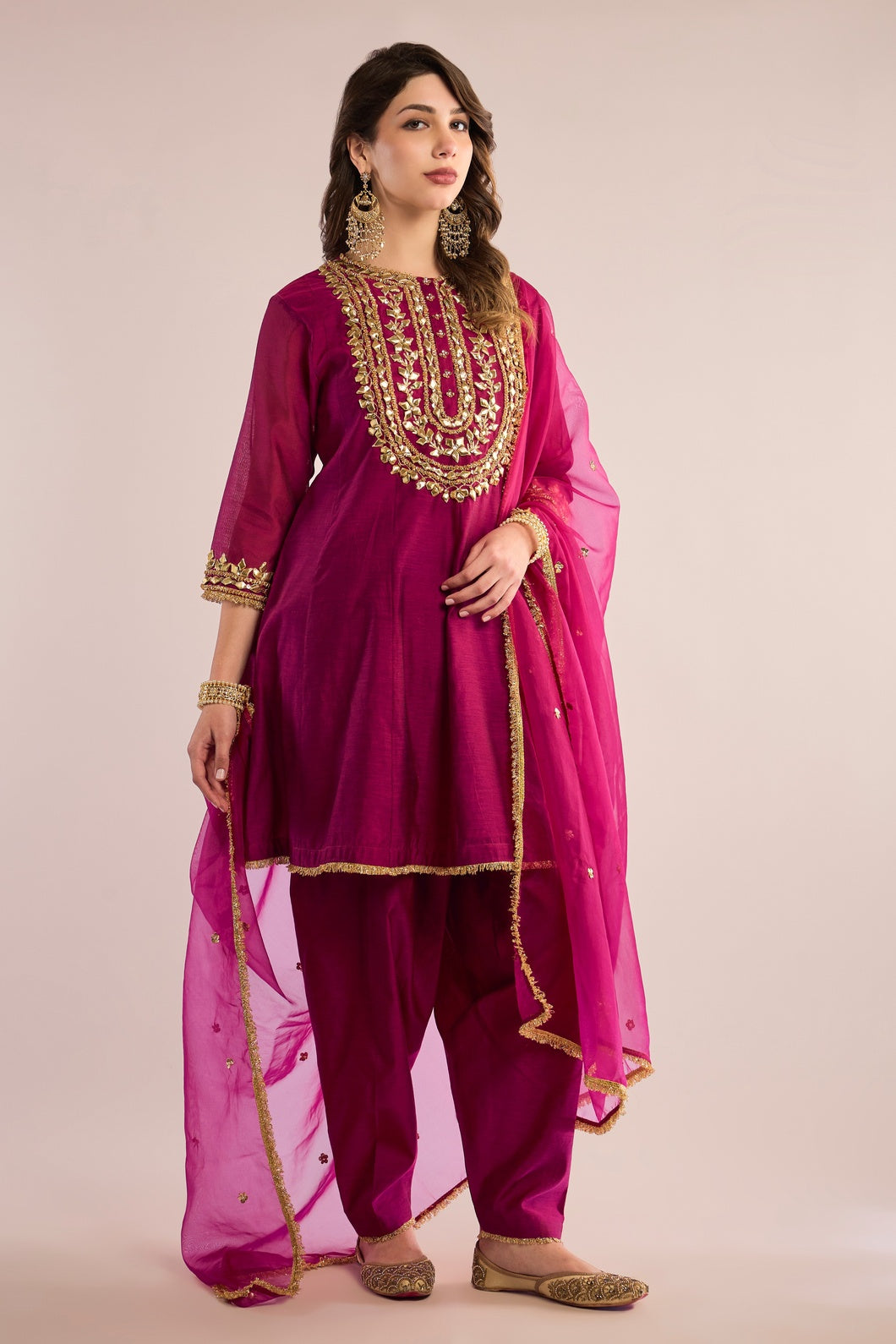 This exquisite Short Anarkali ASMA is crafted from luxurious Chanderi fabric, paired seamlessly with a matching Chanderi salwar. It is elevated by a delicate organza dupatta, beautifully embellished with traditional Gota Patti embroidery. Featuring a classic neckline and three-quarter sleeves, this ensemble exudes timeless elegance and refined charm