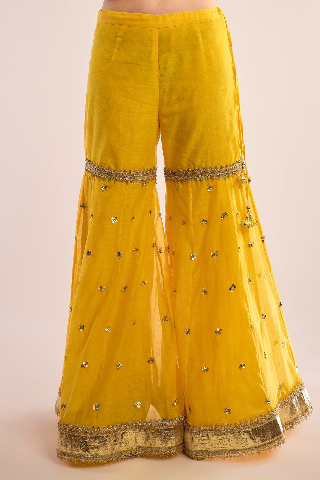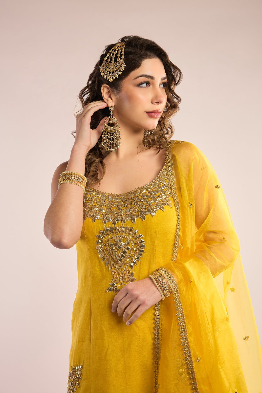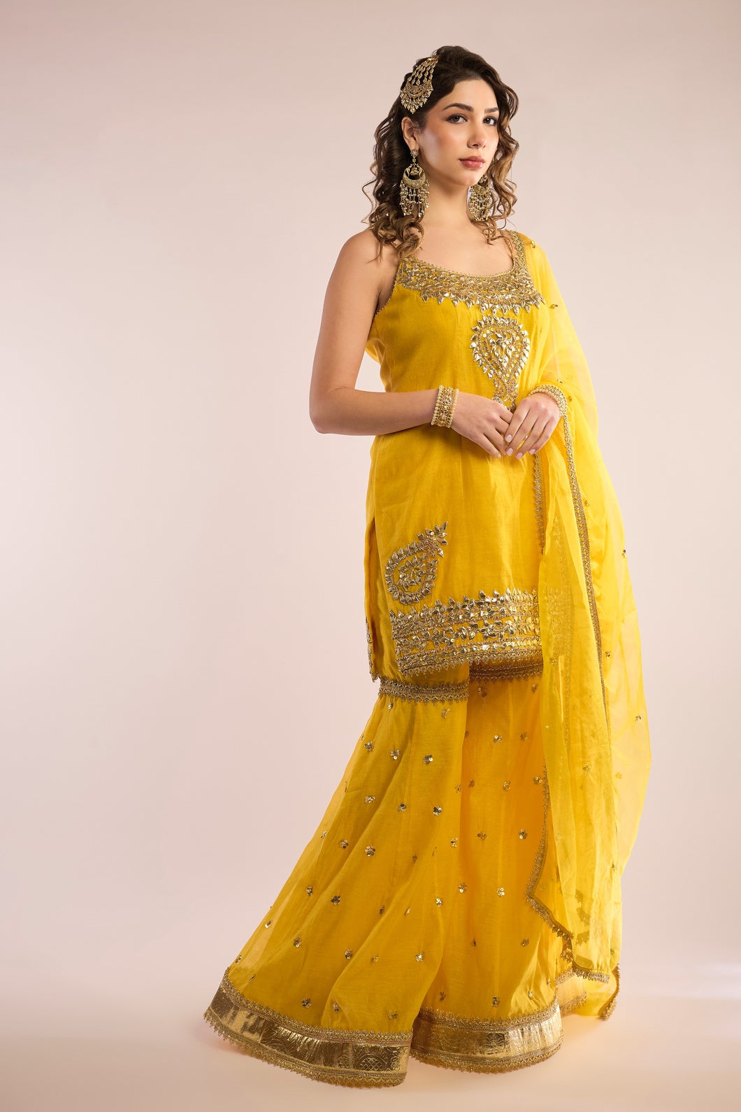 This exquisite A-Line kurta AALIYAH is crafted from luxurious Chanderi fabric, paired seamlessly with a matching Gharara. It is elevated by a delicate organza dupatta, beautifully embellished with traditional Gota Patti embroidery. Featuring a classic neckline and three-quarter sleeves, this ensemble exudes timeless elegance and refined charm