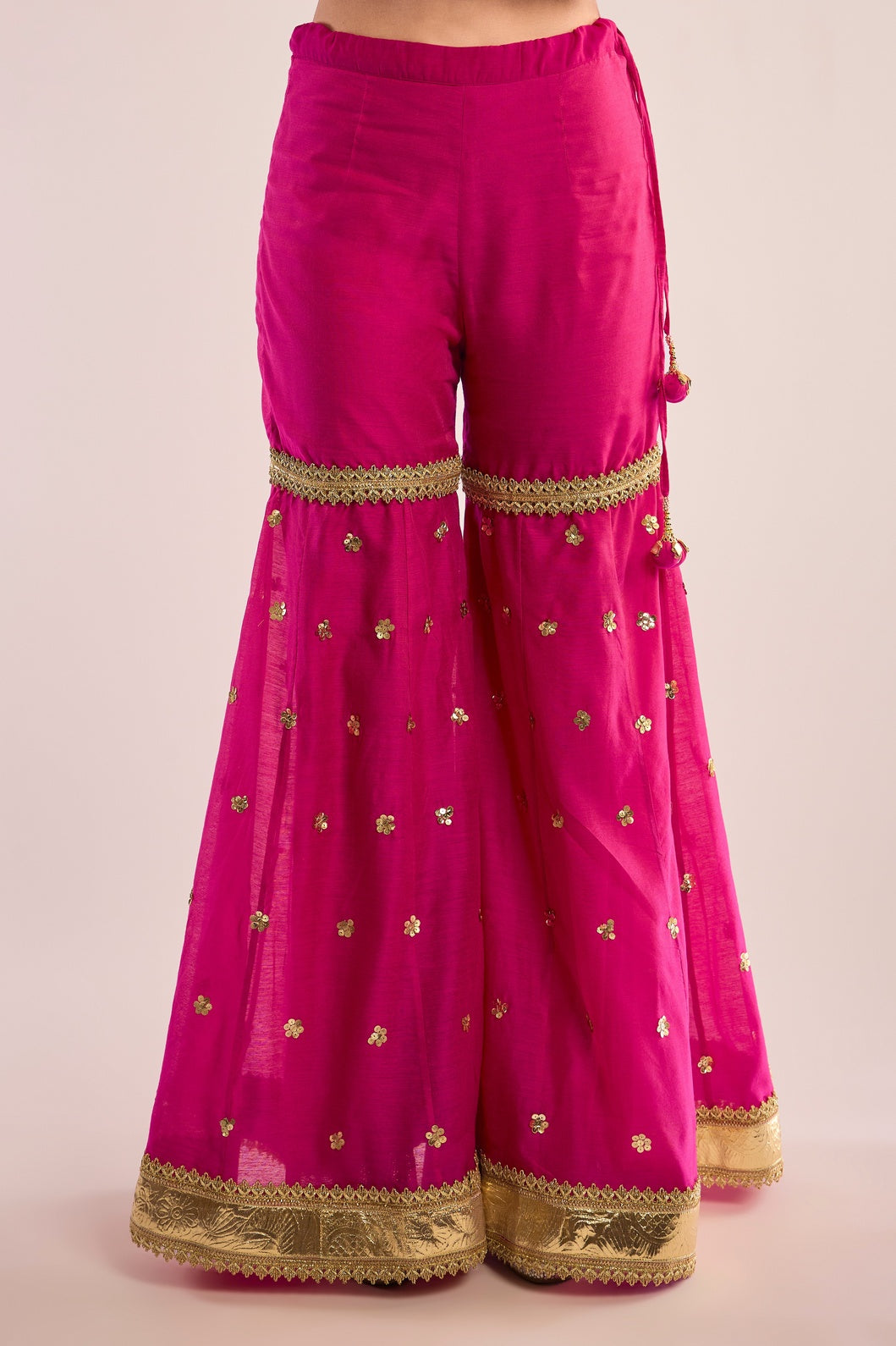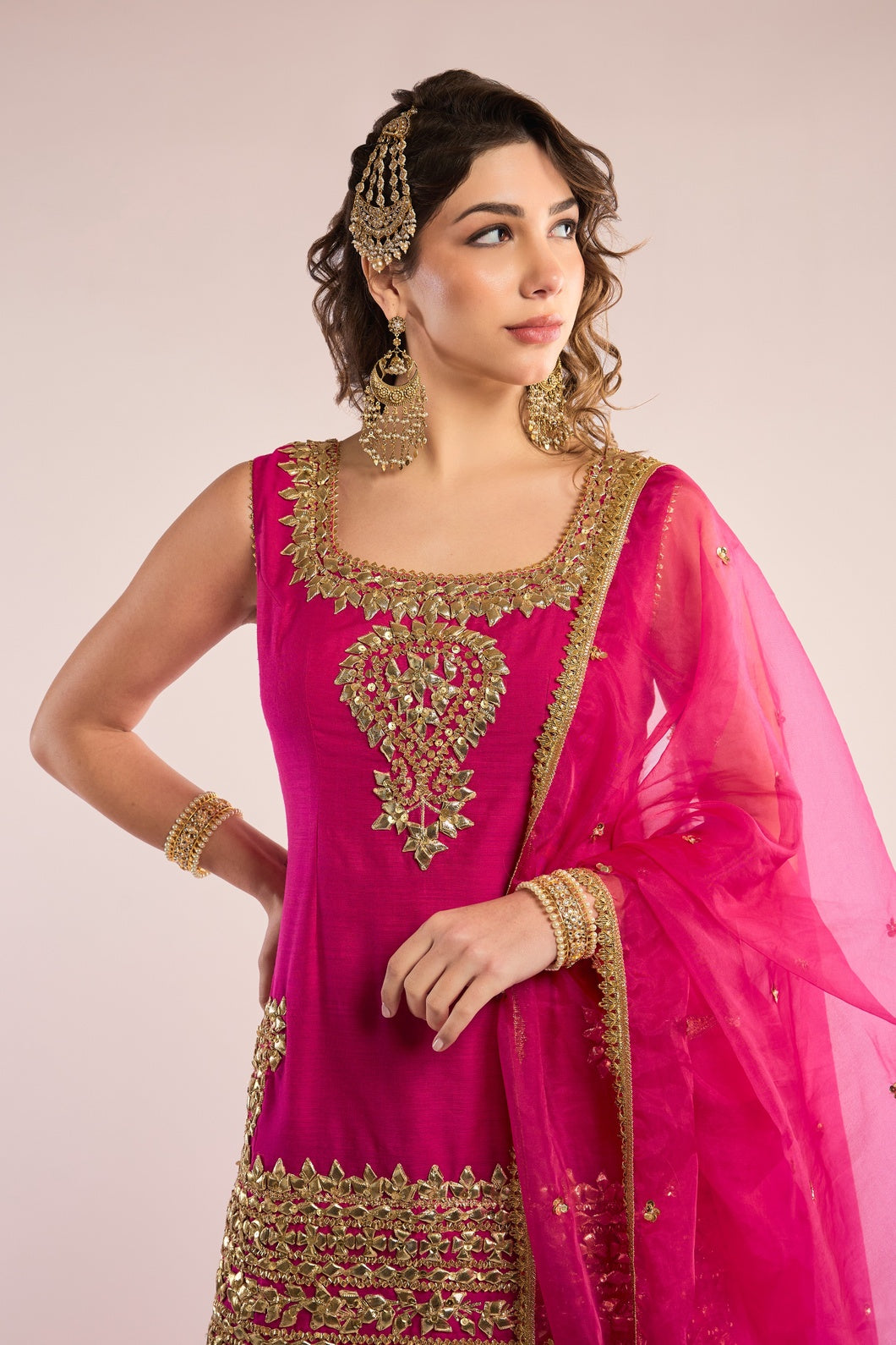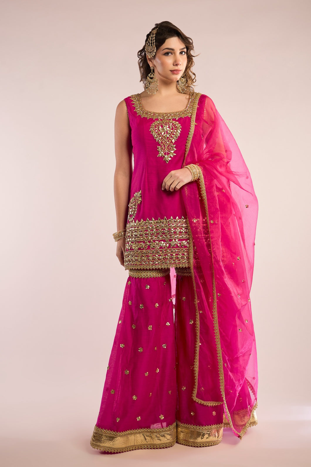 This exquisite A-Line kurta AIZA is crafted from luxurious Chanderi fabric, paired seamlessly with a matching Gharara. It is elevated by a delicate organza dupatta, beautifully embellished with traditional Gota Patti embroidery. Featuring a classic neckline and three-quarter sleeves, this ensemble exudes timeless elegance and refined charm